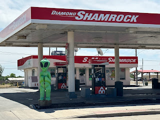 We head east through the endless Plains reminiscent of east Africa replete with dozens of Pronghorn Antelope. A pride of lions would not look out of place. We travel south and through Roswell. Green aliens are everywhere, but no time to stop to make first contact. Onwards south and a quick pit stop in Artesia with a monstrous train pulling out of the Navajo Oil Refinery, blasting its horn as it slowly gathers speed.
